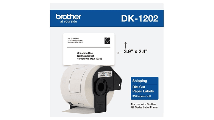 BROTHER DK-1202 | DK1202 | Cinta de etiquetas fondo Blanco - Texto Negro | 300 etiquetas pre cortadas de 62 milímetros de ancho x 100 milímetros de largo | papel térmico y con adhesivo industrial
